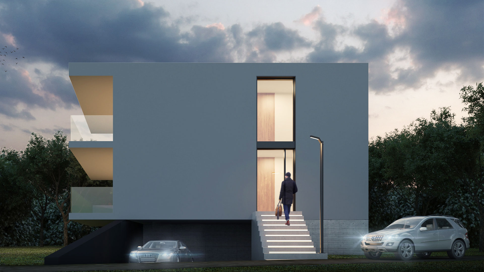 Due to the small size of the land and its trapezoidal shape, the architectural response of the project was to raise the building to gain space with a semi-underground garage and to opt for a simple volume with two distinct faces: