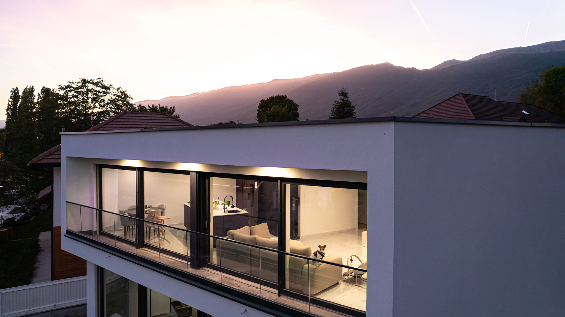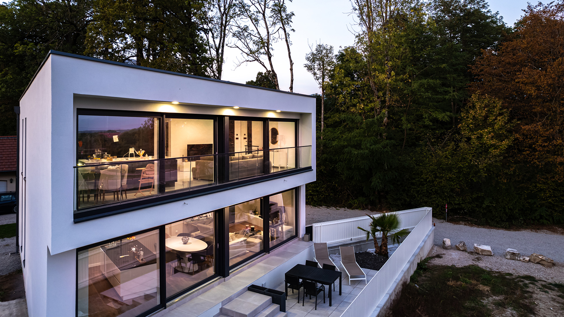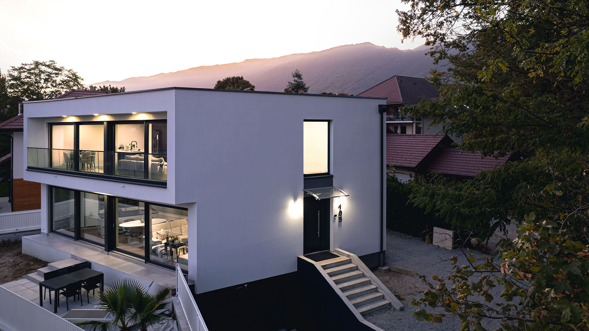The trapezoid-shaped house is located in the dynamic cross-border agglomeration, greater Geneva, in Chevry, on a plot of 424 m2.